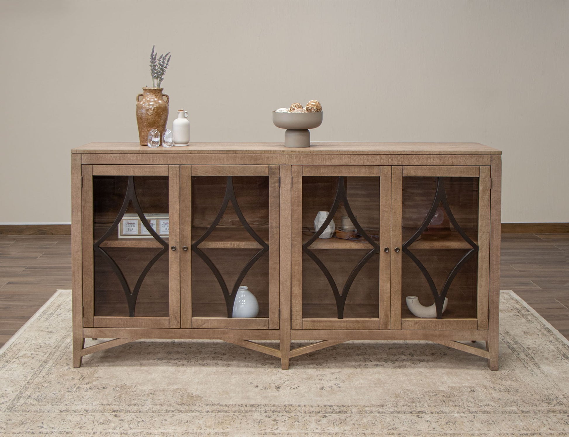 4 Door Console. Transform your living space with the elegance of the Arena collection. Meticulously crafted from solid pine wood, this exquisite collection boasts a glacier finish, inspired by the serene hues of nature, infusing your interior decor with a sense of tranquility.