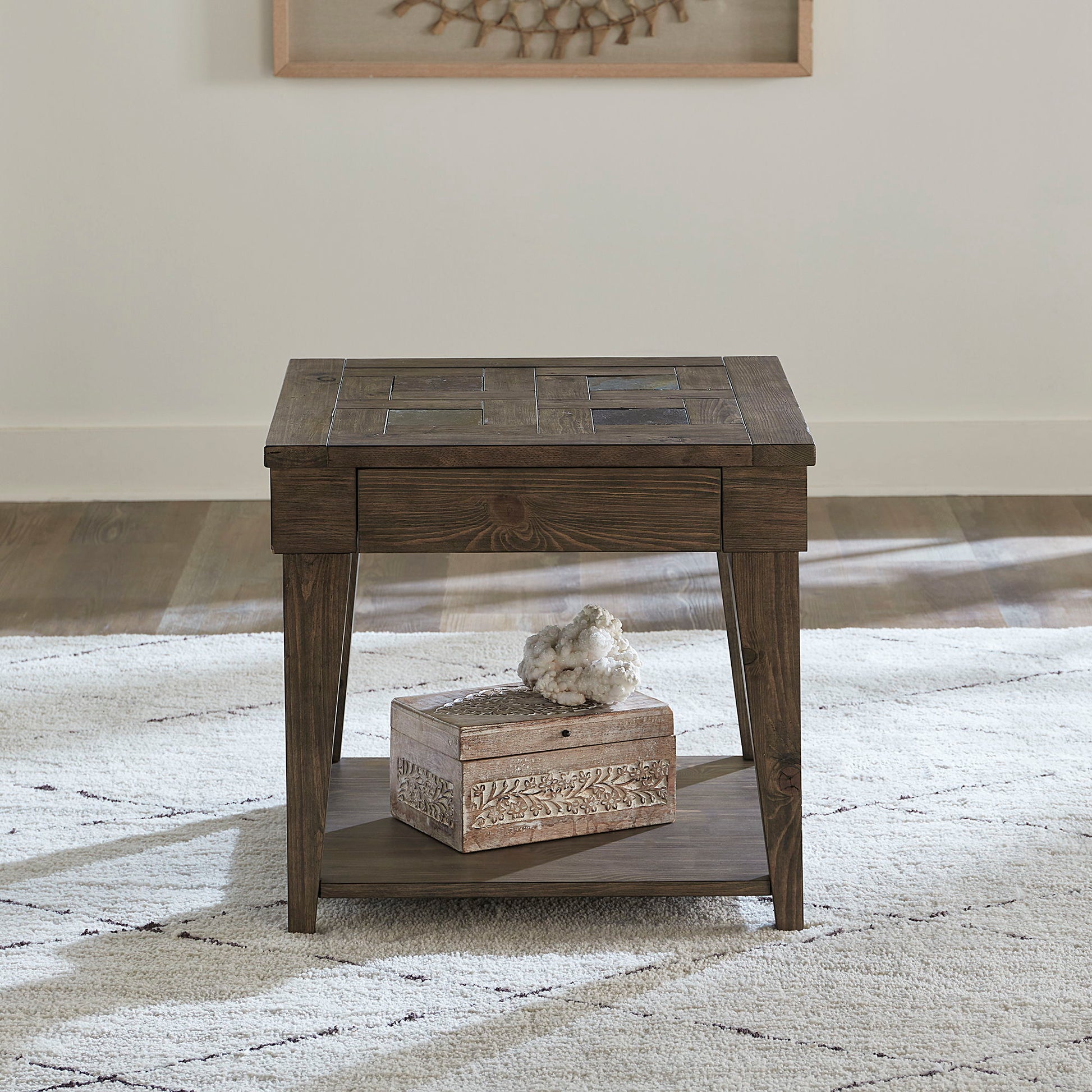 If you enjoy rustic, the Arrowcreek collection is for you. Crafted with solid reclaimed pine and pine veneers and finished in a weathered stone. Features slate tile inserts with a basket weave designed top, lift top cocktail table is great for working from home or dining in your living room and castered for easy movement. Kit consists of one lift top cocktail table and two end tables.