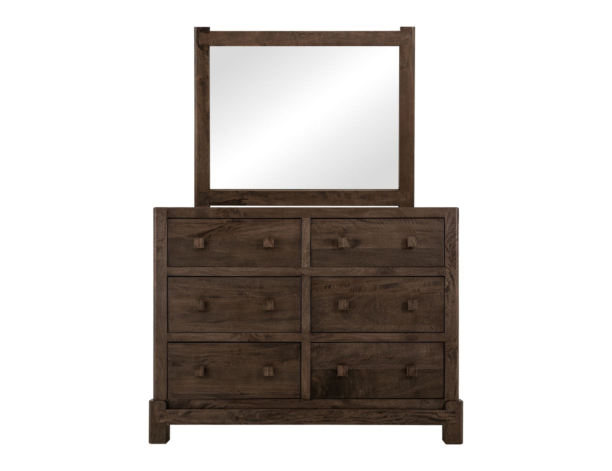 Bedroom Mirror. Bring the beauty of nature indoors with the Dark Atenas Bedroom Set. Experience the harmony of style and functionality. Made from Mango and Melina wood, it features a multi-step lacquer finish that provides a smooth and polished appearance, making it not only aesthetic but also easy to maintain. The dark brown finish accentuates the wood's unique grain patterns, guaranteeing that each item is unique. The Dark Atenas Mirror features dovetail joinery, showcasing exceptional craftsmanship and durability that enhances its rustic modern charm. It is designed to pair perfectly with the Dark Atenas dresser.