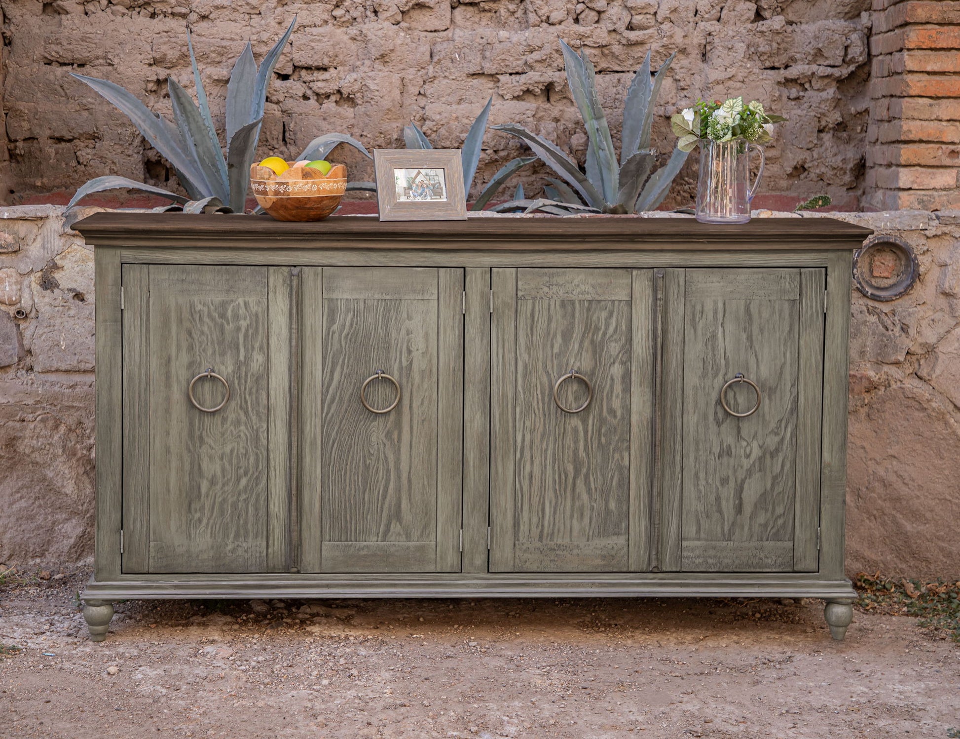 4 Door Console. The Capri console effortlessly introduces a rustic charm to your space. Inspired by the old world, its design features clean lines and hand-turned feet, culminating in a meticulous finish of hand-distressed wood.