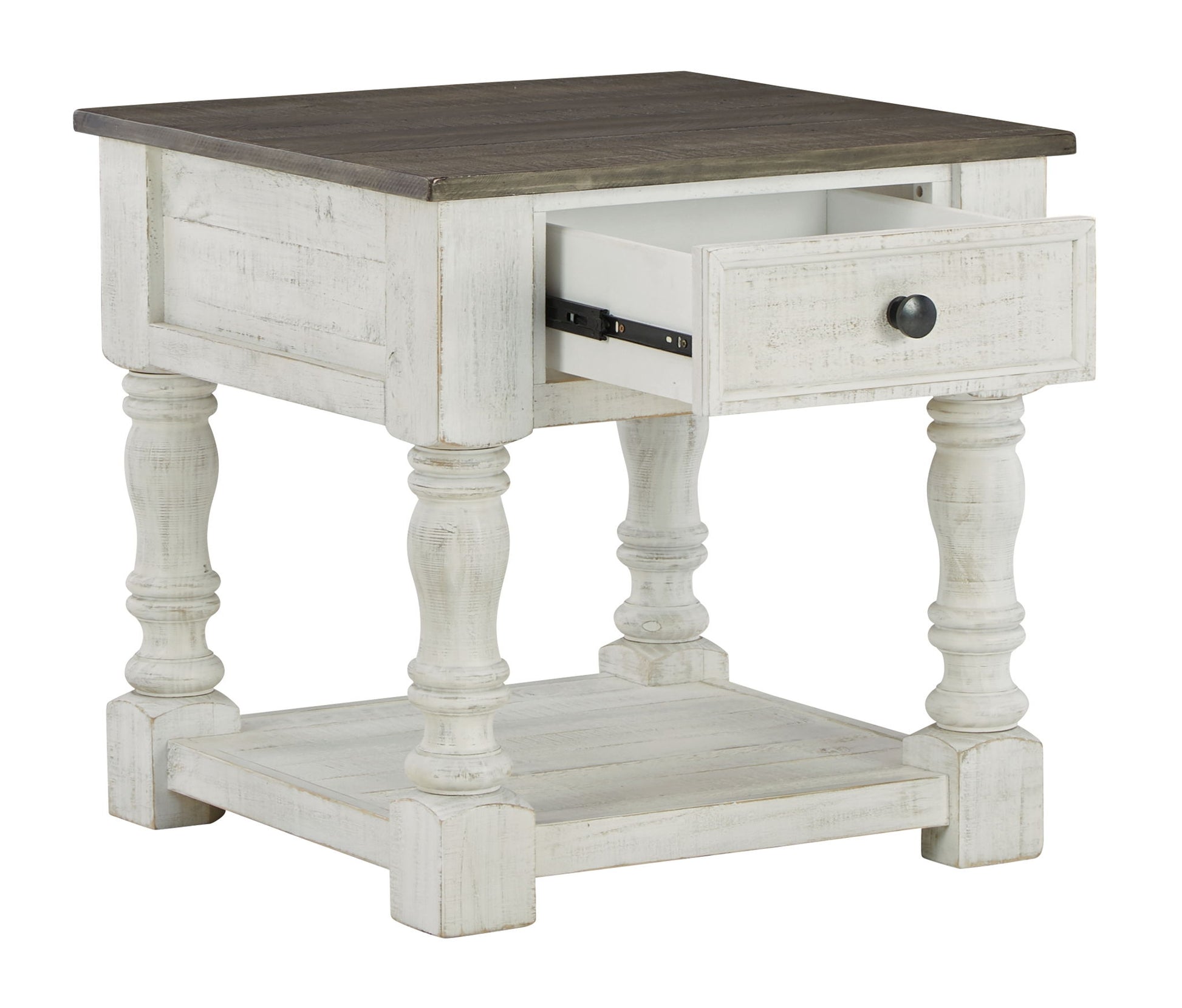 What a fresh interpretation of country classic style. Inspired by American farmhouse craftsmanship, but with an elevated sensibility, this square end table blends distinctive details such as turned post accents and raised drawer fronts for a substantial look that feels right at home. Those who appreciate rustic character should take note of the table’s thick crown moulding, beautified with a vintage two-tone finish. Robust legs lend a hearty, substantial feel ready to withstand the test of time.