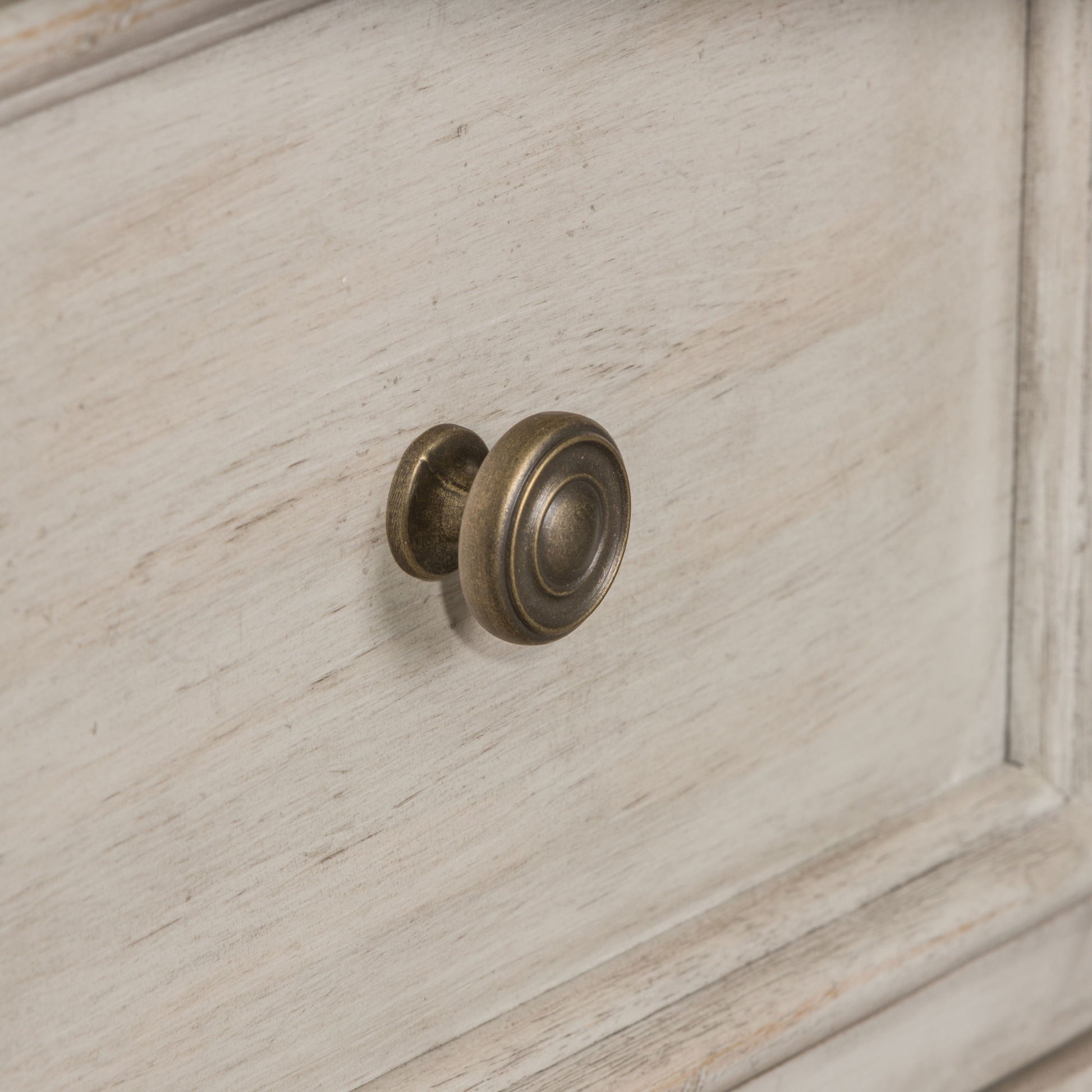 The Heartland 9-drawer dresser is sure to make a statement in any home, as its heavily distressed finish is adaptable to any space. The antique white finish and tobacco tops are accented by raised panels and antique brass hardware. The many drawer sizes allow you maximize storage, with the top drawers being felt lined and the bottom drawers being cedar lined. The wood framed drawers and raised panels on the dresser sides and top creates a classic cottage style.