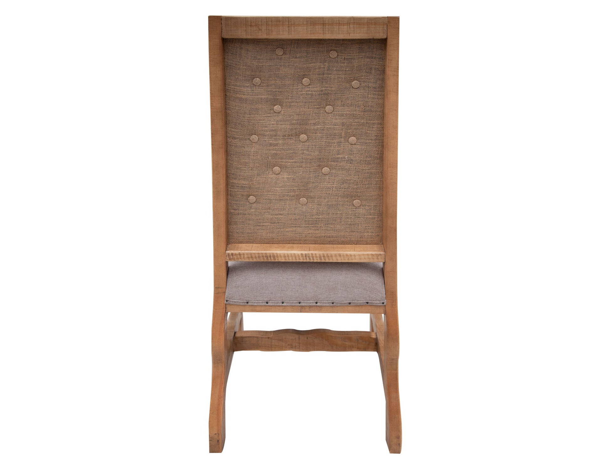 Tufted Backrest Upholstered Chair. Inspired by farmhouse style, our Marquez upholstered chair with a tufted backrest is designed to complement your space, adding a classic touch. It features nail heads behind the backrest and a unique jute texture. The frame is crafted from solid pine wood, making it a sturdy piece of furniture.
