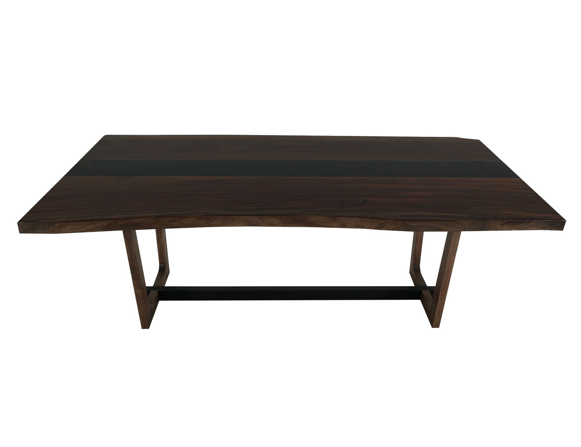 Dining Table Top. The Riverwood table, meticulously crafted from beautiful parota wood, is a stunning centerpiece that perfectly blends nature with contemporary design. It features a striking central epoxy resin strip that flows through the wood's natural live edges, enhancing its organic appeal while adding a modern flair. The trestle base is made from mango and Melina wood and is designed for exceptional sturdiness and ample legroom. The table is finished with a translucent, multi-step lacquer that highlights the captivating interplay of rich brown and deep black tones, making it a striking addition to any dining space. Whether you are hosting an intimate family dinner or a lively gathering of friends, the Riverwood table is where lasting memories are created and cherished. More than just a piece of furniture, it truly serves as the heart of your home.