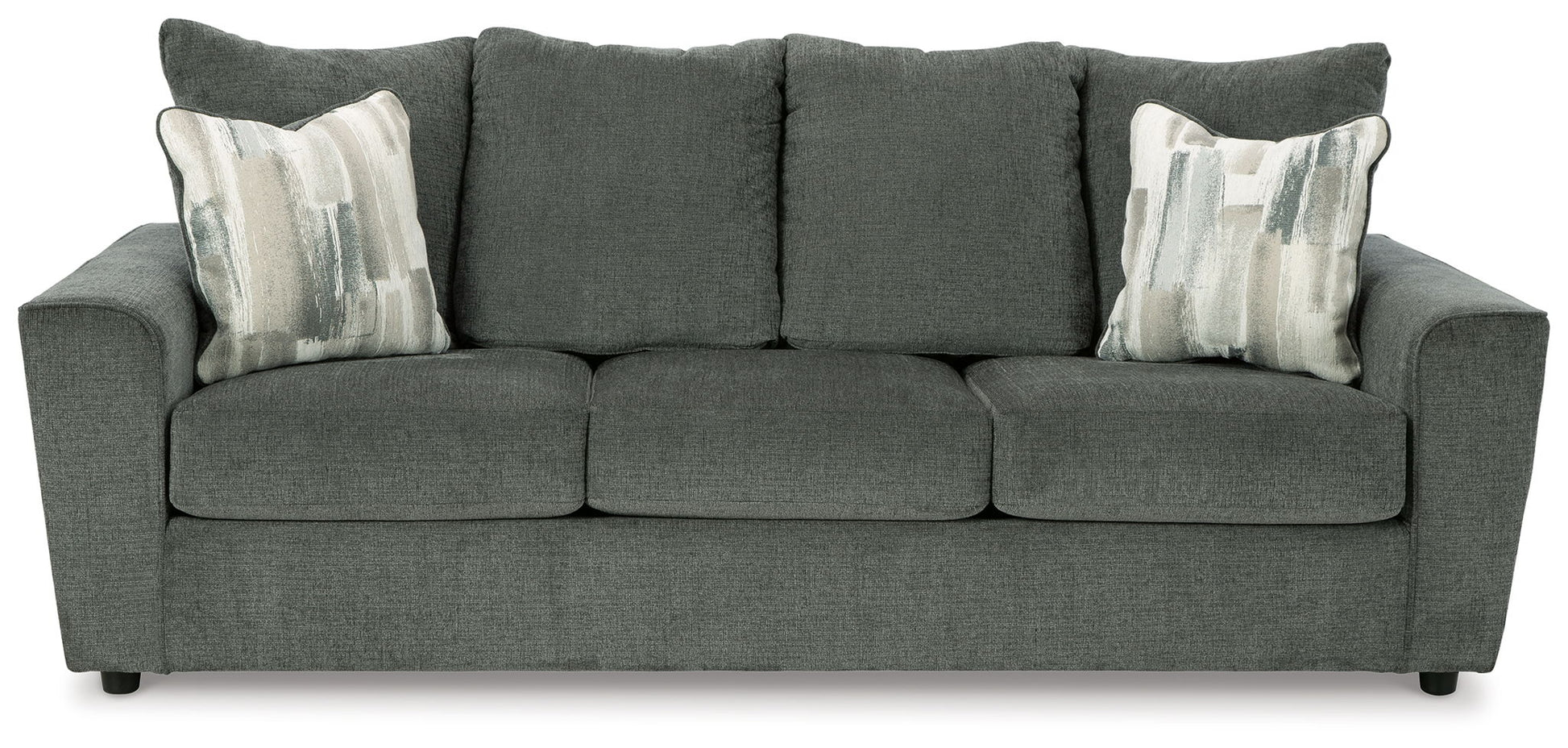 What’s new in neutrals? Shades of gray, of course. Embrace the sophisticated design trend with this gorgeous sofa, which offers a clean-lined, contemporary style at a comfortably cool price. Sure to lift your spirits, the plush chenille fabric is fabulously neutral. Modern flared arms give it a distinctive flair. This sofa also arrives with two cool brushstroke accent pillows to elevate the taste and comfort level.