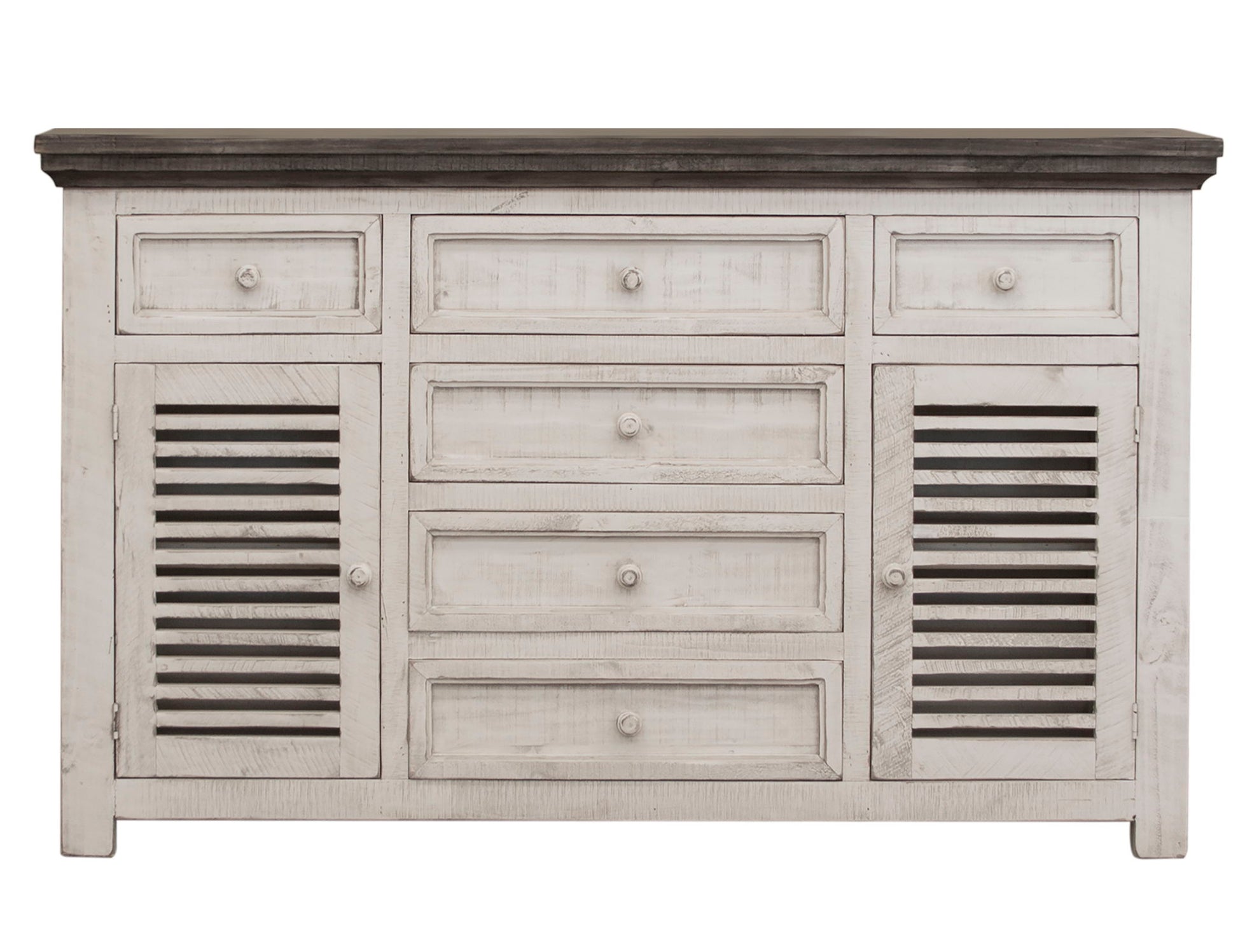 6 Drawer 2 Door Buffet. Exuding farmhouse chic with just the right touch of old-world charm, the Stone Collection is meticulously crafted from solid pine wood. The wood is lightly distressed, showcasing a white finish and complemented by weathered gray tops.