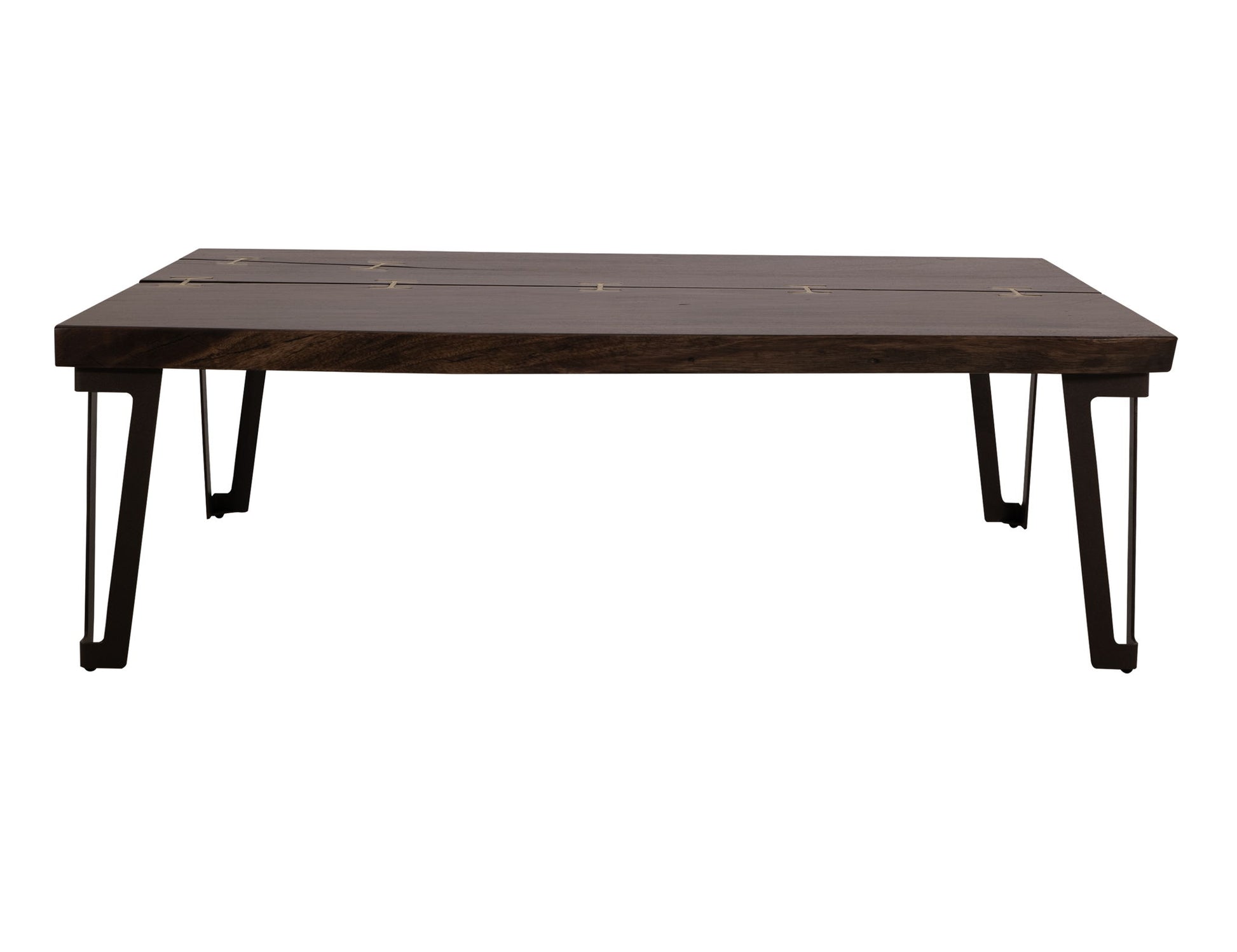 Cocktail Table. Elevate your living space with these stunning Walnut Occasional Tables. Each table features a breathtaking live-edge parota wood top, highlighting the wood's unique grain patterns and natural imperfections. The translucent multi-step lacquer finish's rich reddish-brown hue enhances the wood's beauty, while the gold-finished metal "I" inlays add an elegant touch. Each table blends the rustic charm of natural wood with the sleek sophistication of metal. This harmonious design makes these tables a striking addition to any living room.